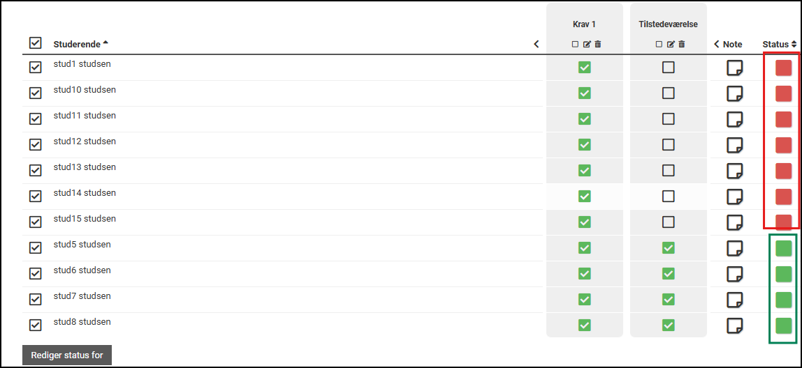 - Det er muligt at overrule markeringerne på kravene ved at give en anden samlet Status for en eller flere studerende