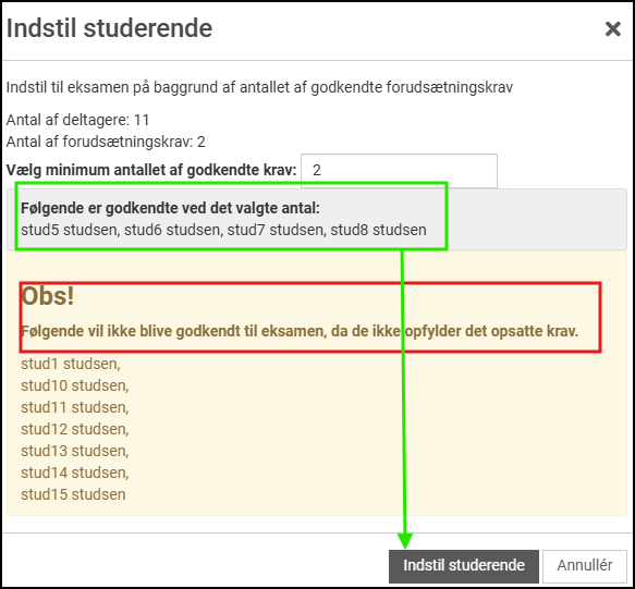 - Indsæt minimumsantallet af krav og klik på Indstil studerende